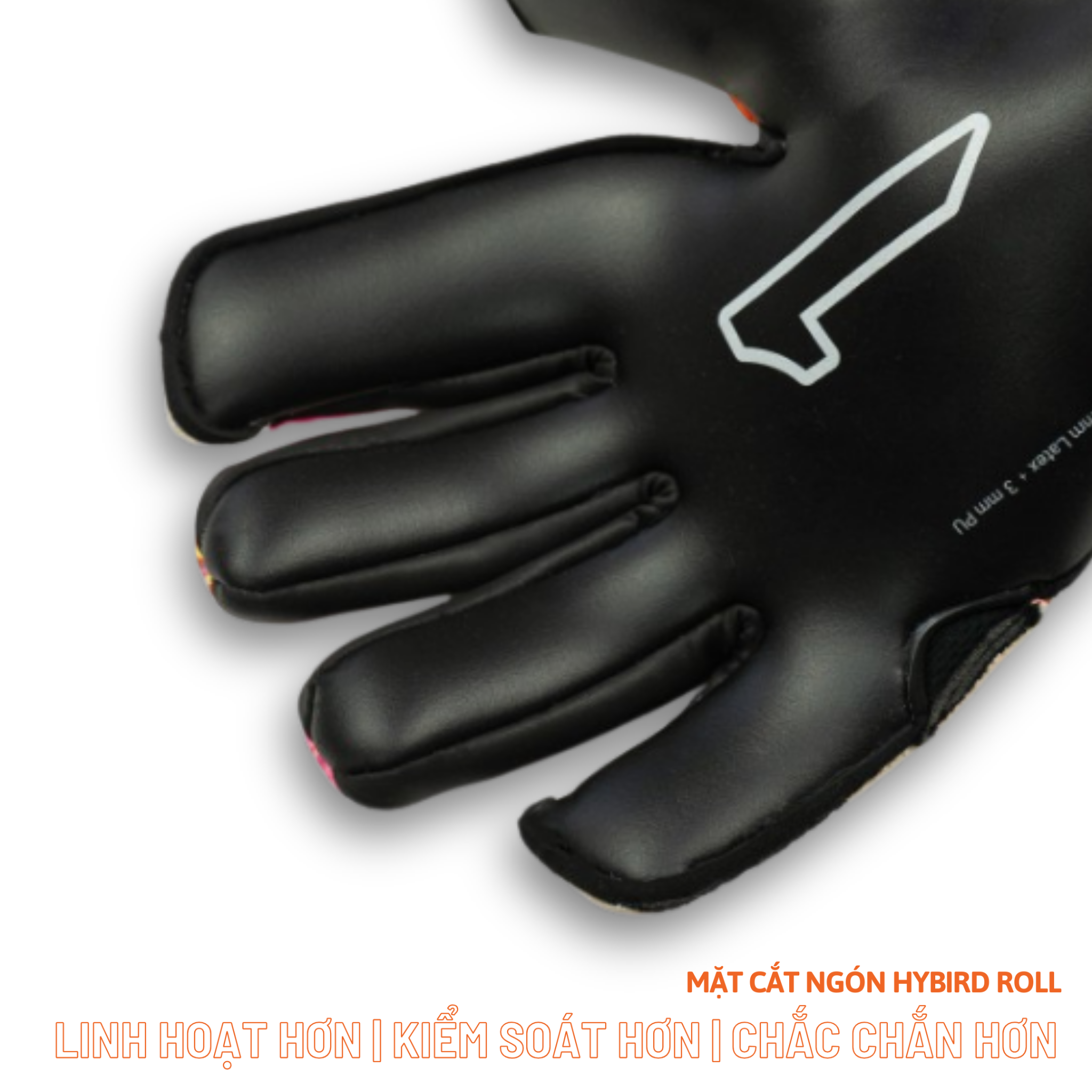 Phần Rollfinger mở rộng diện tích tiếp xúc latex – giúp tăng khả năng bắt bóng. Trong khi đó, đường may âm (Negative) mang lại cảm giác ôm sát và kiểm soát tốt hơn.Thiết kế công thái học (ergonomic) giúp bàn tay ở vị trí tự nhiên nhất khi thi đấu.