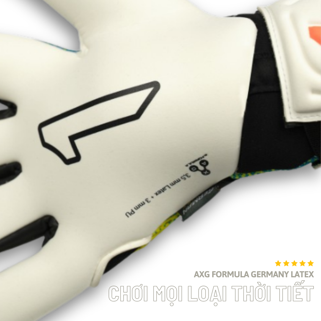Lòng bàn tay (Palm): Latex thế hệ mới AXG® của Đức, được phát triển riêng cho Rinat, đảm bảo độ bám cực mạnh ngay cả trong điều kiện mưa ướt. Mang lại hiệu suất vượt trội, cân bằng hoàn hảo giữa độ bám đỉnh cao và độ bền – loại latex ướt cao cấp hàng đầu.